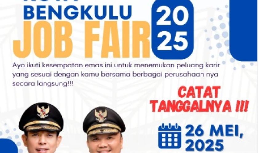 JOB FAIR Kota Bengkulu rencananya akan digelar pada tanggal 26 Mei 2025 di Adeeva Hotel, pantai panjang. Kegiatan dimulai pagi hari pukul 08.20 s.d 15.00 WIB. Diketahui sebanyak 40 perusahaan ikut dalam kegiata bursa kerja ini. Mereka membuka booth untuk informasi lowongan kerja.