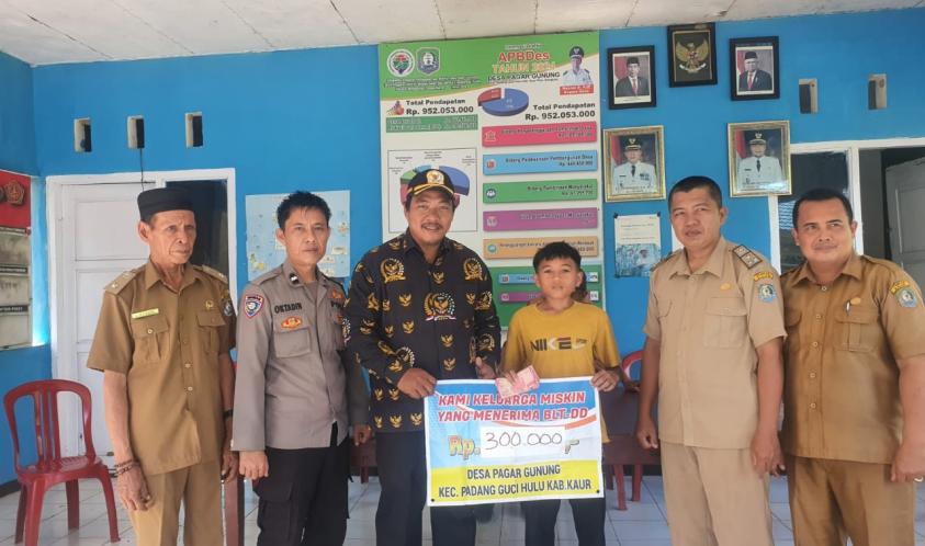 Kaur - Bhabinkamtibmas Polsek Padang Guci Hulu Polres Kaur Polda Bengkulu, Aipda Oktadin Wilyanto, menghadiri kegiatan penyaluran BLT DD di Desa Pagar Gunung Kec. Padang Guci Hulu Kab. Kaur, Senin (01/7/2024).