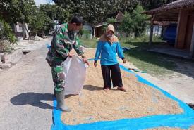 PATI - Anggota Satgas TMMD 111 Kodim 0718/Pati membantu warga menjemur padi, Itu sebagai bentuk kepedulian.