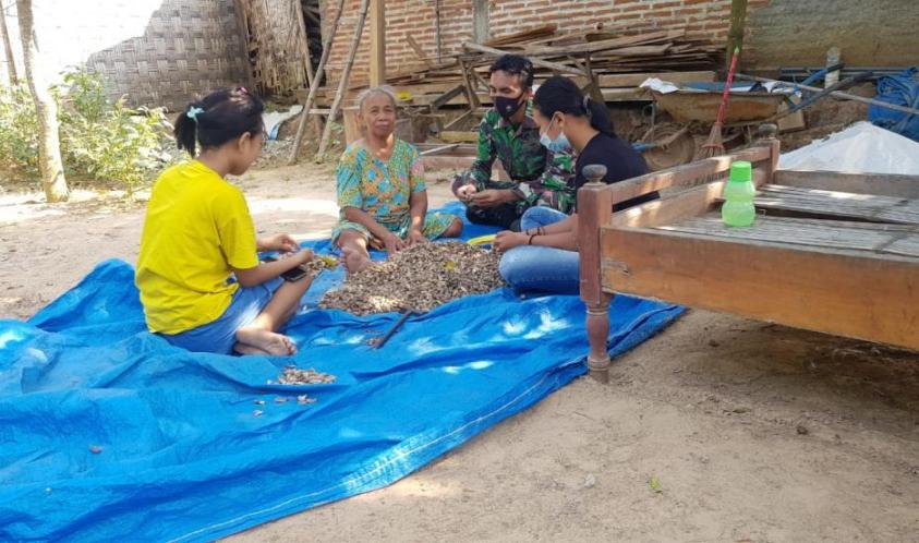 Pati - Mbah Yati (63) yang kesehariannya bekerja mengupas kacang tanah bercerita kepada Personil Satgas TMMD ke-11 Kodim 0718/Pati Serda Sukarji saat dikunjungi di kediamannya Dukuh Kemiri RT.04/01, Desa Tamansari, Kecamatan Jaken, Kabupaten Pati, Senin (07/6/2021).