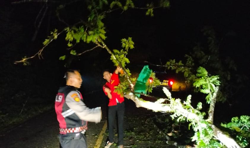 "Personil piket Polsek Talo mendapatkan laporan dari pengendara pengguna jalan bahwa ada pohon tumbang menghalangi jalan raya, sehingga personil langsung menuju lokasi dan bersama masyarakat sekitar menyingkirkan pohon tumbang tersebut." jelas Kapolsek Talo Iptu M.Haryanto.