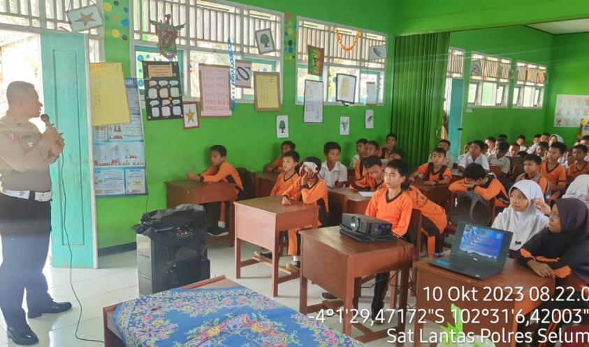 Seluma - Unit Kamsel Sat Lantas Polres Seluma Polda Bengkuu, dipimpin Ipda Sumanto, S.H., pada hari Selasa (10/10/2023) melaksanakan kegiatan Sosialisasi Dikmas Lantas di SDN 04 Desa Talang Tinggi Kecamatan Seluma Barat Kabupaten Seluma.