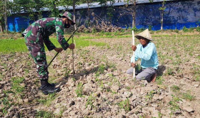 Pati - Tampak Serda Sukarji anggota Satgas TMMD Reguler ke-111 Kodim 0718/Pati ketika usai bekerja dari sasaran fisik TMMD, yakni pengecoran jalan pertanian sepanjang 1.450 meter, sedang membantu Bapak Sarjono dalam kegiatan pengajiran tanaman cabainya.
