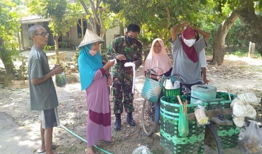 Ungkap Sutini (61) Warga Desa Tamansari yang menjual sayuran ke Desa Sumberejo dan menikmati jalan Cor yang telah di bangun, dalam perbincangannya dengan salah satu anggota Koramil 16/Jaken yang sedang membagikan masker.