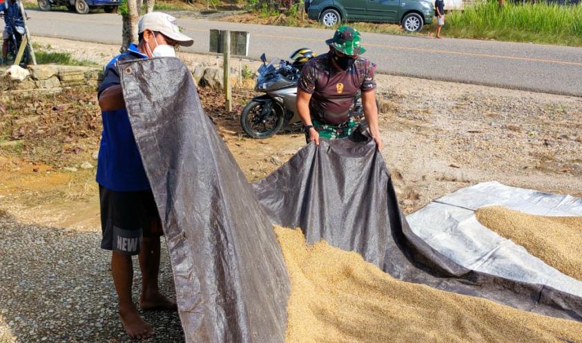 BARITO UTARA - Satgas TMMD bantu warga jemur padi Anggot Satgas TMMD ke-111 Kodim 1013/Mtw membantu salah warga Desa Karamuan Kecamatan Lahei Barat Kabupaten Barito Utara, menjemur padi di halaman tempat tinggalnya, Pada hari Rabu (09/06/21).