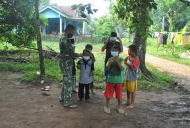 Cegah Covid 19, Anggota Satgas Memakaikan Masker Ke Anak Kampung Daraham sebelum bermain