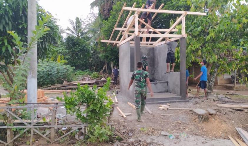 Guna menjaga keamanan warga Kampung, Anggota TNI membangun pos kamling. Pembuatan pos kamling saat ini masih pada tahap pemasangan Kasau untuk atap bangunan.