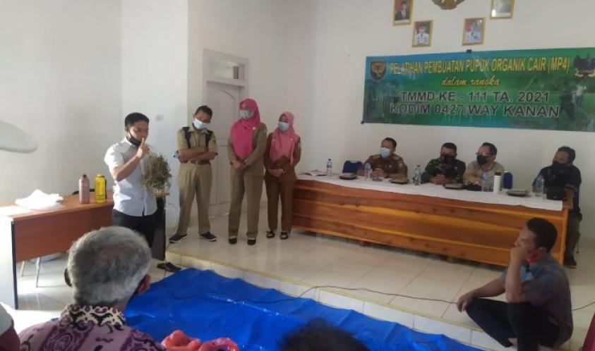 Di pelaksanaan Kodim Way Kanan 0427/Way Kanan memasuki minggu pertama di Kampung Negeri Batin Kecamatan Umpu Semenguk, Kabupaten Way Kanan, Anggota TNI berikan pelatihan pembuatan pupuk organik cair bagi kelompok Tani di kampung tersebut.